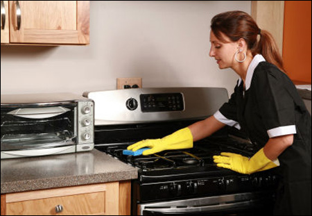 Sử dụng giấm trắng được bảo quản trong bình xịt. để một chút giấm lên một miếng vải mềm và lau trên mặt bếp, tránh những bề mặt xốp hoặc đá Granit. Nếu dầu mỡ quá nhiều, sử dụng một miếng vải sợi ngâm trong chất tẩy nhờn pha với nước. Và đừng quên lau chùi nóc tủ lạnh, chúng cũng khá nhờn.