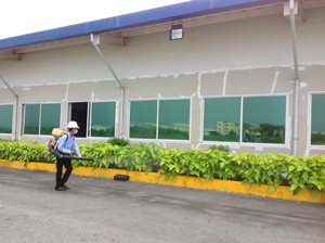 Dùng máy phun áp lực phun trực tiếp vào các khu vực vành đai bên ngoài, nơi ẩn nấp và phát sinh tiềm tàng như: hàng rào xung quanh công ty, hệ thống thoát nước,... nhằm xua đuổi & tiêu diệt trực tiếp, hạn chế xâm nhập vào bên trong....